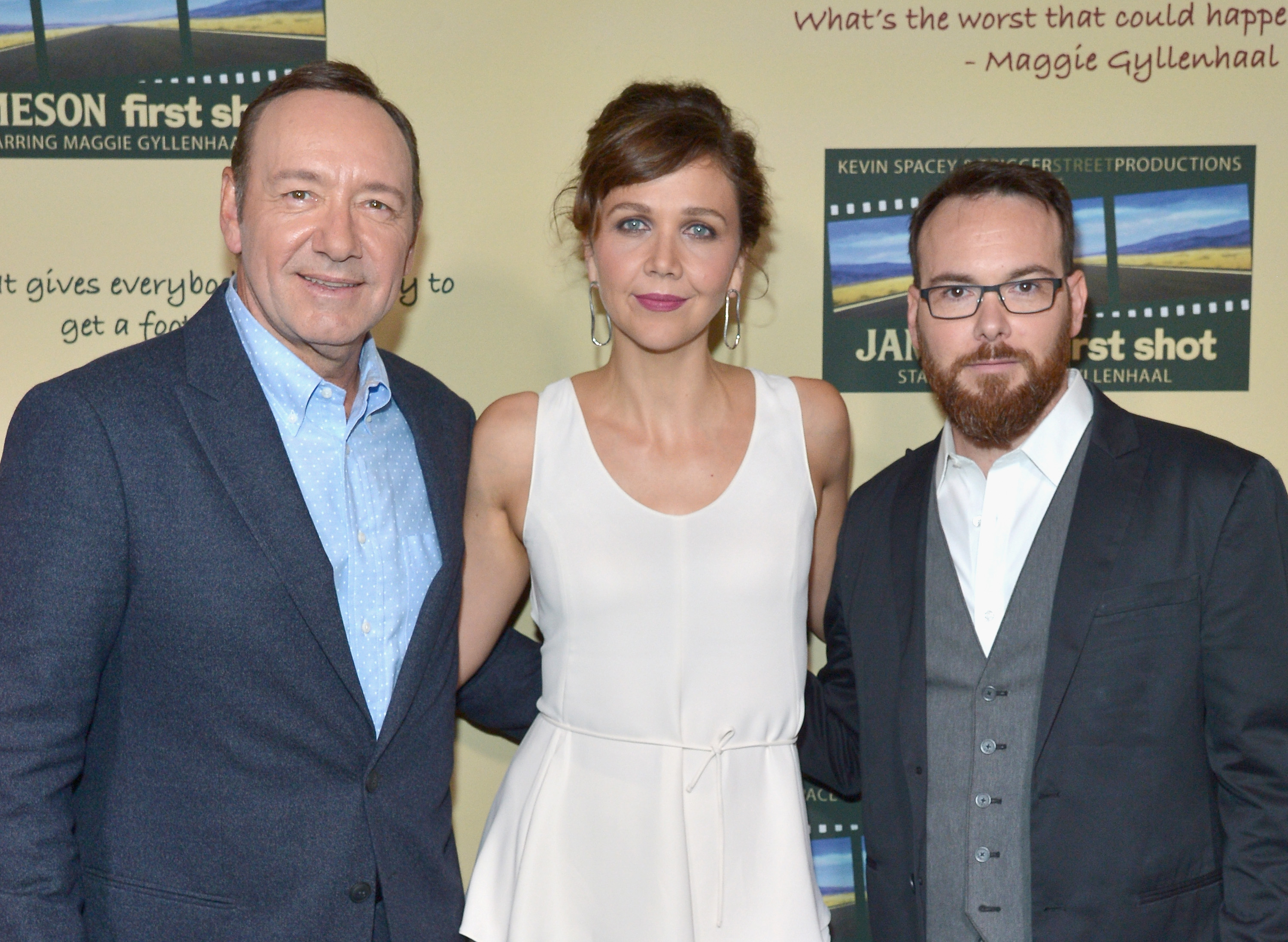 LOS ANGELES: (L-R) Academy Award winner Kevin Spacey, Golden Globe winner Maggie Gyllenhaal and award winning film producer Dana Brunetti celebrated the Jameson First Shot short film competition at Paramount Pictures Studios in Los Angeles. Photo: Charley Gallay/Getty Images for Jameson/Pernod Ricard