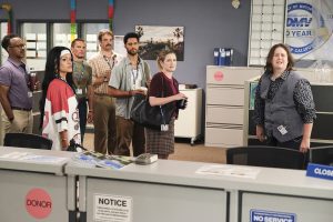 (l-r) Tim Meadows as Gregg, Gigi Zumbado as Ceci, Tony Cavalero as Vic, Alex Tarrant as Noa and Harriet Dyer as Colette in DMV. ©CBS Broadcasting. CR: Bertrand Calmeau/CBS